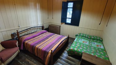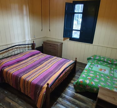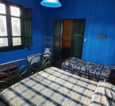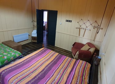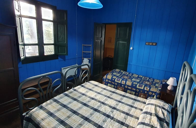Camera doppia o quadrupla, luminosa con due letti matrimoniali e arredi in legno chiaro, ideale per famiglie.