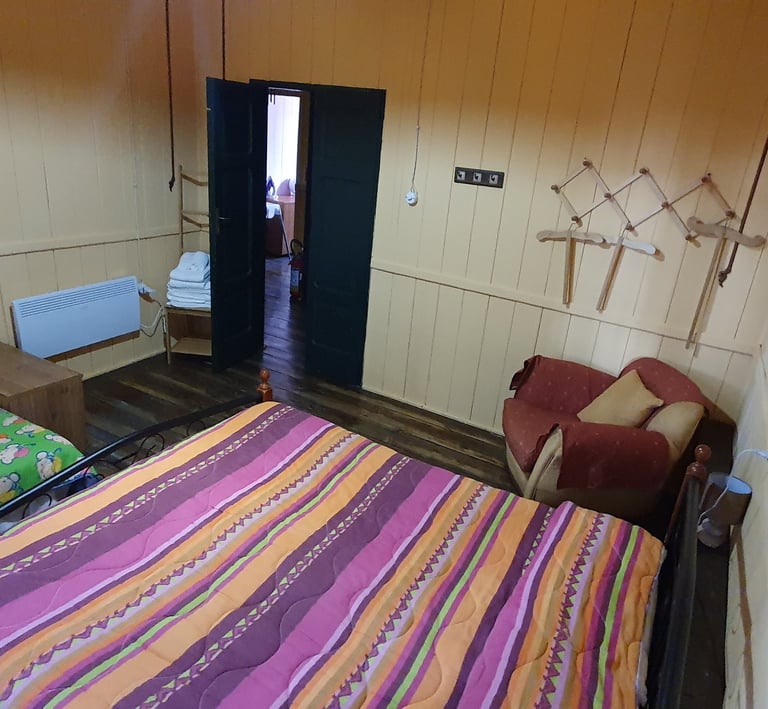 Camera doppia luminosa con letto matrimoniale e arredi in legno chiaro, ideale per famiglie.